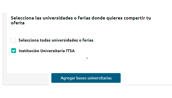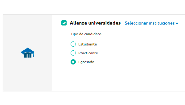 En la sección Quiero publicar mi oferta en, seleccione la opción Alianza universidades e indique el tipo de candidato solicitado.