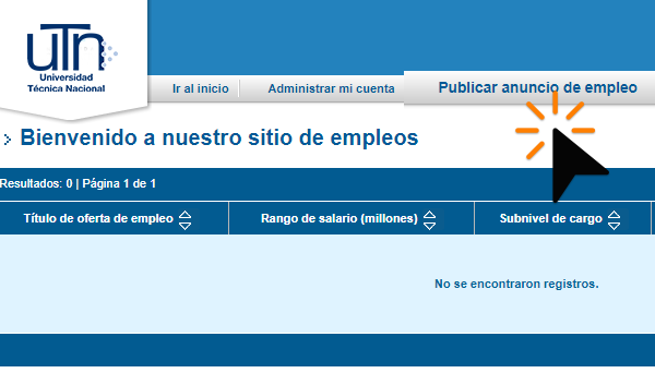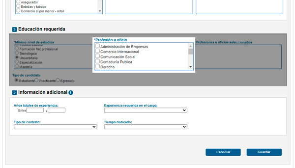 Complete los datos de la anuncio Rellene la información requerida, tenga en cuenta en el formulario Educación requerida, seleccionar alguna de las profesiones de La Universidad Técnica Nacional. Para finalizar haga clic en el botón guardar.